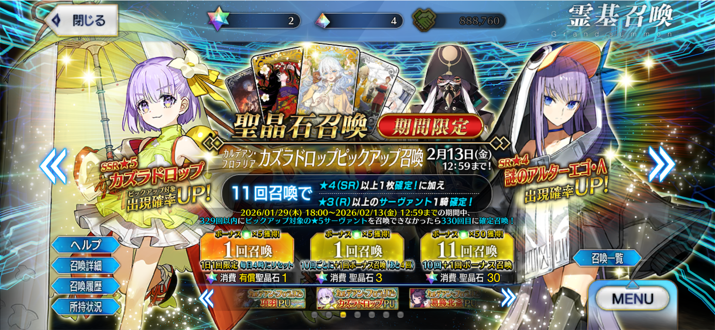 絶賛開催中のイベントにあわせて、サクラファイブのひとりである「カズラドロップ」がピックアップ召喚に当たってます。メルトリリス推しのわたしとしては(もちろんBBちゃんをはじめとしたサクラファイブは推してますよ)何とか入手したいところ。